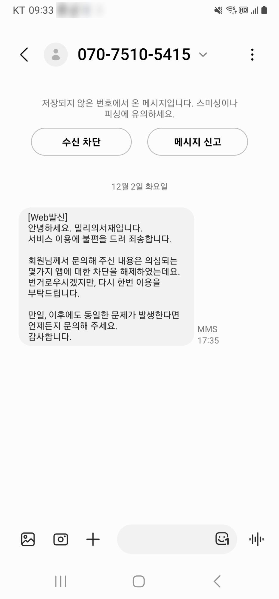 - 사용 중인 보안앱·백신앱에서 밀리의 서재 차단 해제